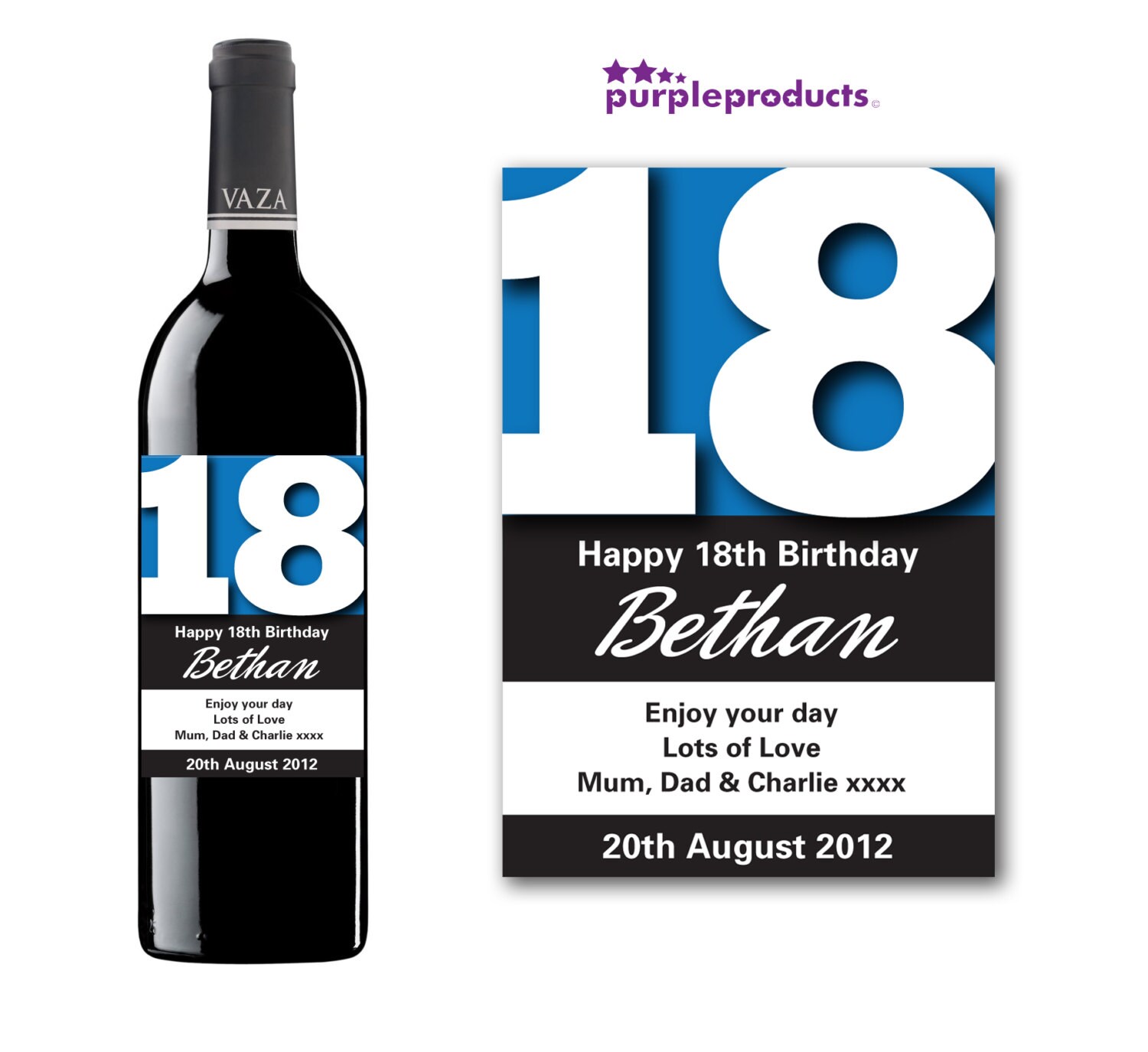 A Fun 18th birthday Personalised Wine Bottle Label This cool wine bottle label can be personalised to reflect the big occasion. Simply add the name, date and any personal details or message to transform a plain wine bottle into a great and fun gift for the big eighteenth birthday celebration. With a big '18' this design reflects the momentous age when the boy or girl becomes a man or woman.